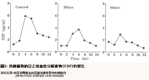 由5位健康的義工做實驗,攝取富含多種機能成份的納豆之後,以拉底斯凝固法測定血液中的血栓分解產物(FDP),並且根據FDP值的變化做成座標圖。(圖2)