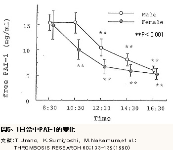 腦塞栓和心肌梗塞較常發生於清晨,這和體內PAI-1的生理時鐘相關。圖5可以看出,1日當中血液中PAI-1濃度的變化。顯示出早上數值較高,白天開始到黃昏逐漸下降,清晨會回覆到高點,因此可以了解,血栓症較常發生於深液到清晨這段期間。