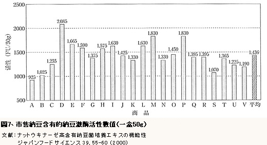 市面上販售納豆含有的納豆激酶活性數值參差不齊,盒裝50g的納豆大約含有1400 FU一盒。活性較高的產品大約含有2000FU/一盒。(圖7)
