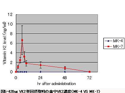 我們已能確定一次攝取420μg的維他命K2時,則MK-7在血液中的量會增加, 但是攝取MK-4的組別中則未能於血液中檢測出MK-4。