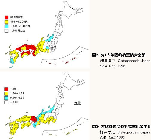 此外我們得知,納豆的消費金額(量)與大腿骨頸部骨折中有反比關係,食用越多納豆的地區,其骨折率越低。另一方面,與黃豆加工食品的攝取量並無關聯。