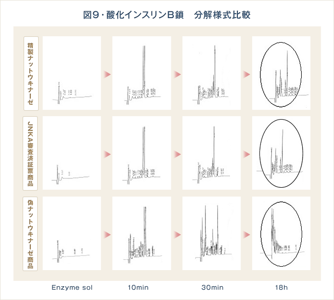 精製ナットウキナーゼ、JNKA審査済証票商品およびナットウキナーゼを標榜する偽ナットウキナーゼ商品の酸化インスリンB鎖分解様式を図9に示します。比較すると、偽ナットウキナーゼ商品の分解様式がナットウキナーゼの分解様式と異なっています。そのためナットウキナーゼでないことがわかります。