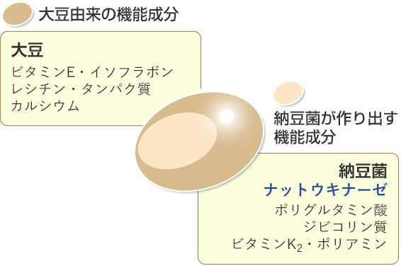 長年、わが国の健康を支えてきた伝統食品である「納豆」。この納豆のネバネバ部分に含まれるタンパク質分解酵素がナットウキナーゼです。 納豆は、煮大豆を納豆菌が発酵させることでできる食品ですが、この発酵過程でナットウキナーゼをはじめとする多様な栄養素が生成されます。1925年、北海道帝国大学の大島先生によりその精製および性質について報告がなされており、その後様々な研究報告がなされ、1980年代にフィブリン(血栓の素となるタンパク質)を分解(溶解)する酵素が「ナットウキナーゼ」として命名されました。