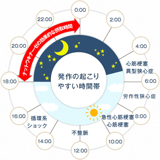 血栓は深夜から早朝にかけて出来やすいため、ナットウキナーゼを摂取する時間帯は夕食後や寝る前がよいと考えられます。40代以上の方、ストレスの多い方、血圧が高めの方、高脂血症や糖尿病などで血液粘性の高い方等には、特に定期的な摂取をお勧めします。