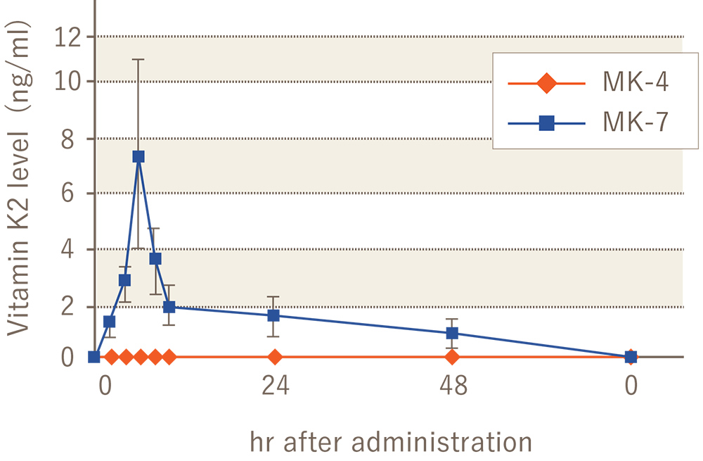 一度に420μgのビタミンK2を摂取すると、MK-7は血液中の量が増加することが確認できましたが、MK-4を摂取したグループでは、血液中からMK-4が検出されませんでした。 MK-4は吸収率が低いか非常に壊れやすいために、腸管から吸収されて肝臓に至るまでに壊れてしまう可能性があります。